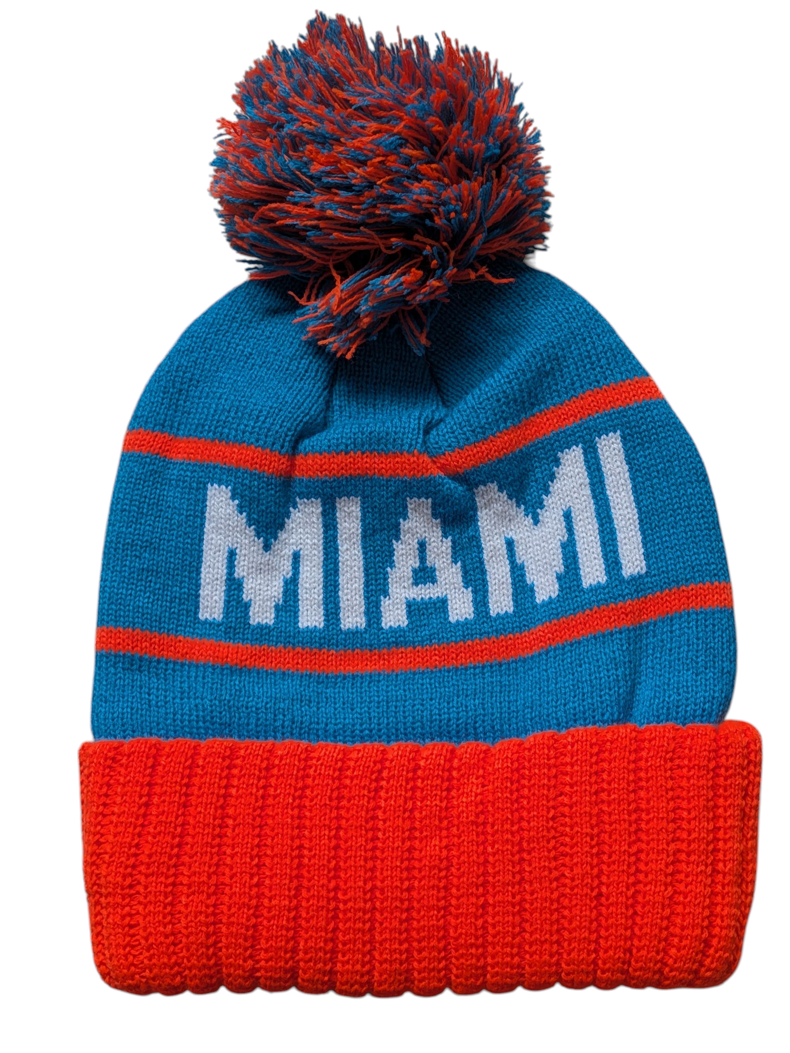 Miami City Name Bubble Knit Aqua/Orange Pom Beanie Skull Cap